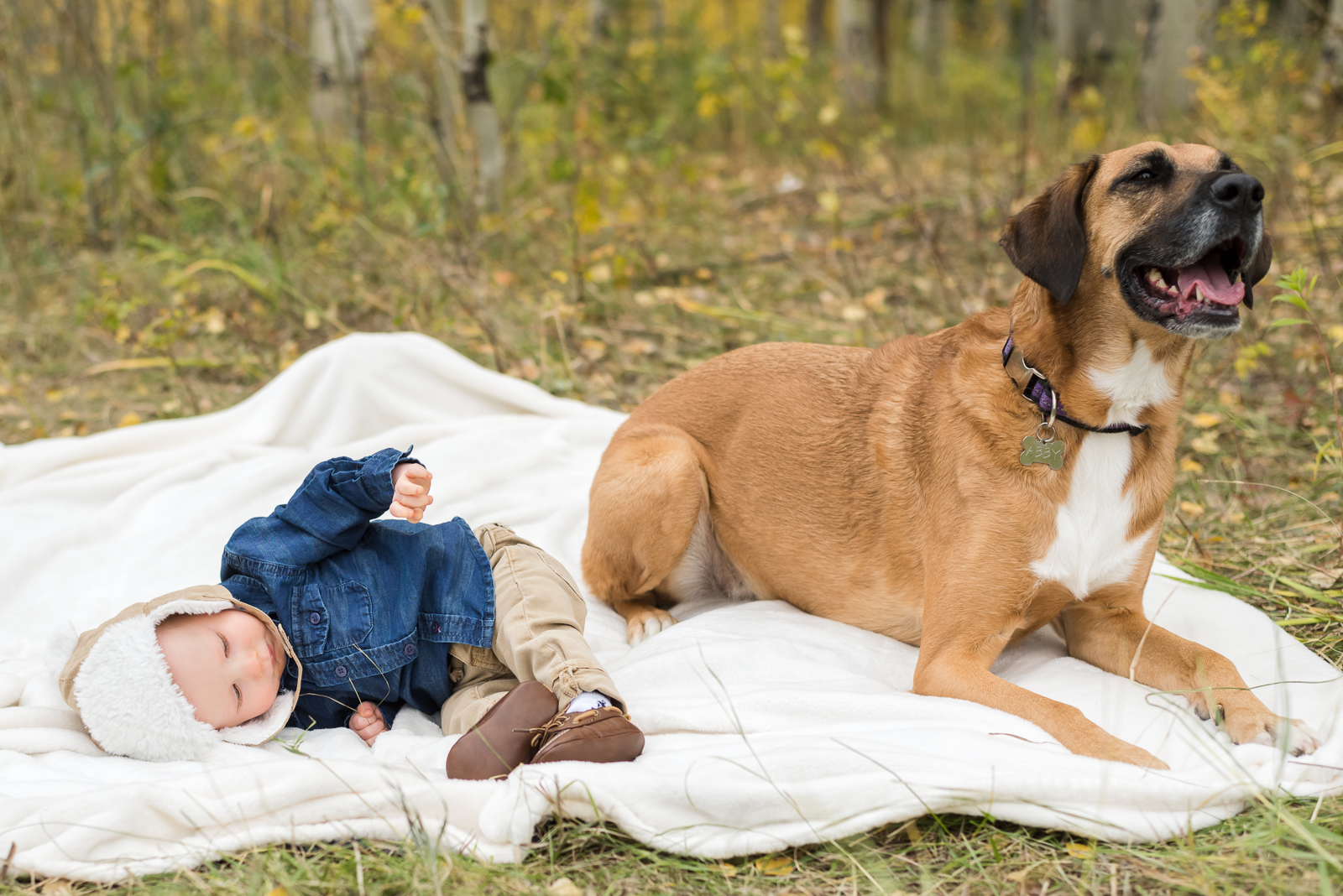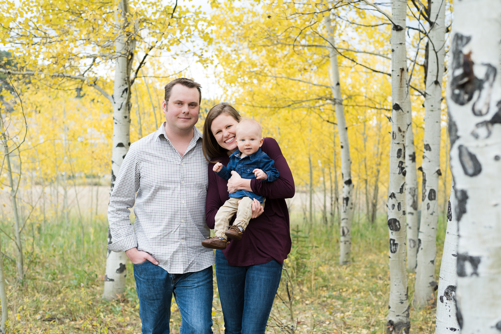 Octobers are for bursting colors on trees, hot tea cuddled under a blanket, and your favorite flannel and jean combo. Octobers, though, can also be for family outings for that perfect picture. We went to Meyer Ranch Park for the Grimes family photos among the yellow aspen trees. We loved capturing this family not only because of their amiable personalities and kindness, but also because they brought along two of our favorite things: an adorable little boy and dog!