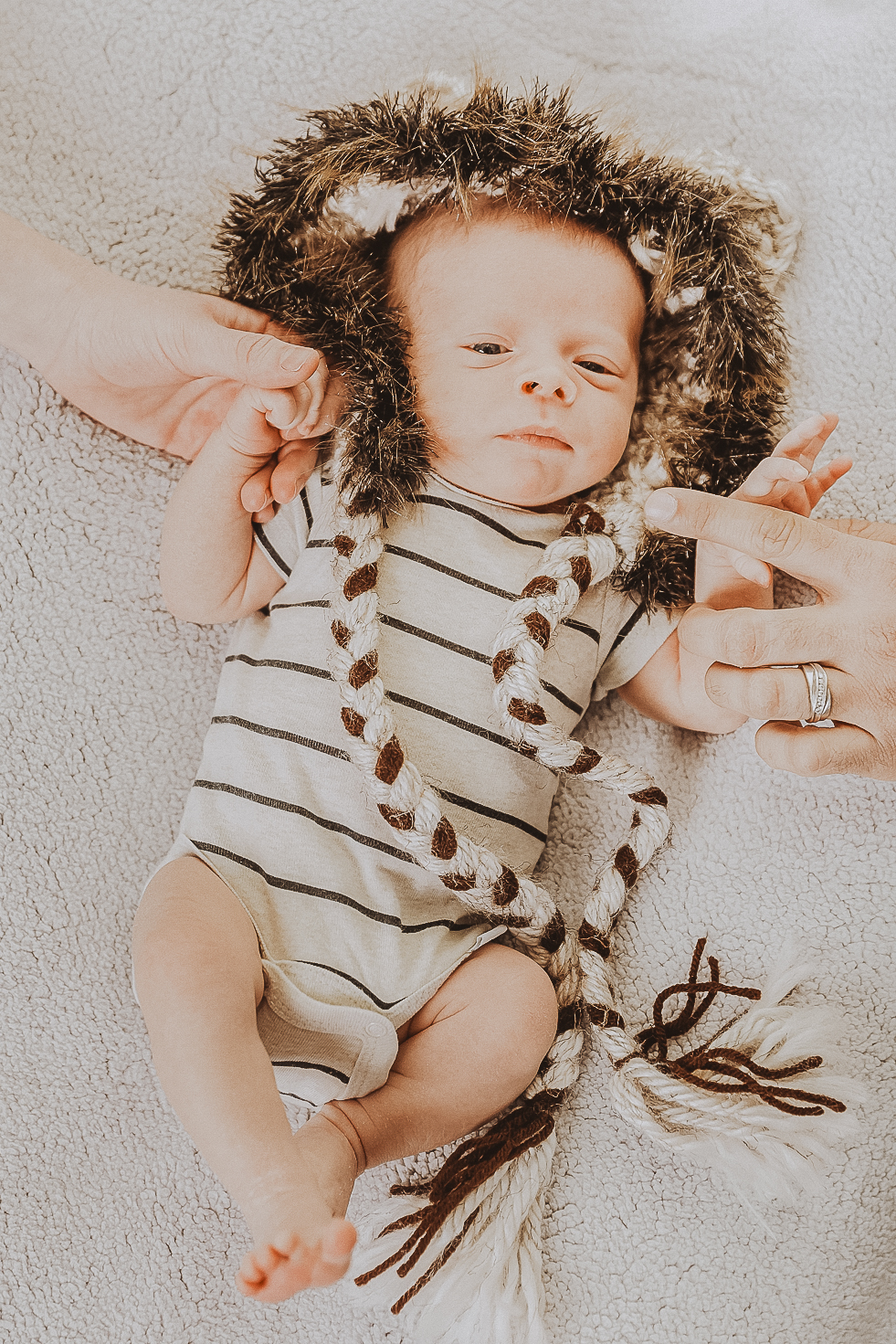 Here are some common Pinterest-inspired props that parents like to include: wedding rings, fuzzy blankets, knitted hats and matching socks, favorite stuffed animals and toys, baskets with wide bases, scarves, and family heirlooms.