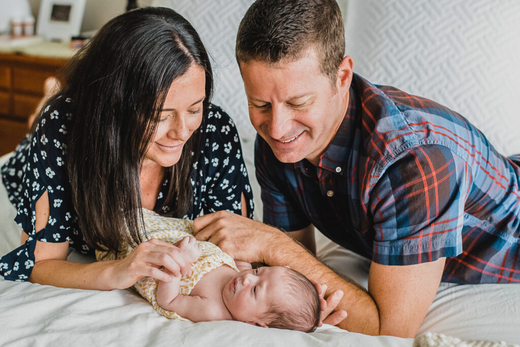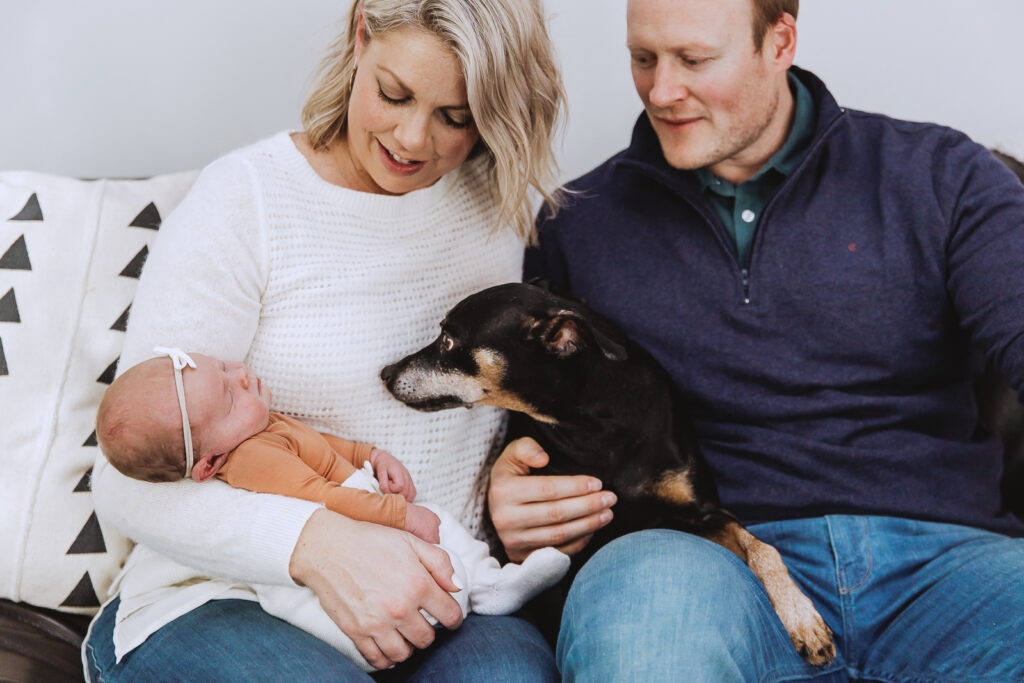 Yes, your new baby is the star of the photo session, but that doesn’t mean mom and dad can’t jump in a couple of photos, too. Don’t forget about the furry family members! We try to focus on capturing candid moments between the baby and family members so we encourage you to invite others over. Who doesn’t want to ooh and awe of the cutest little person in the room! Keep in mind that you might need to add on extra photography time as you add more people.