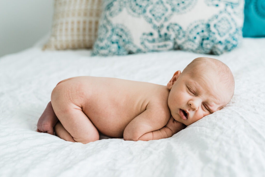 Naked babies get cold. One of the more important tips for parents for a successful newborn photo session is keeping the baby warm. We suggest cranking up the temperature in the house to a comfortable 80 degrees about half an hour before your session start time. Space heaters work well too if you would prefer. The warmer temperature will hopefully help your newborn stay asleep and happy.