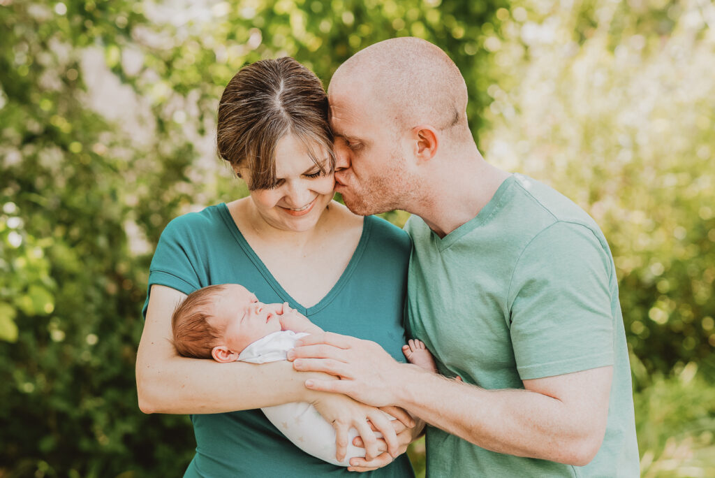 The last thing on your mind is probably what you need to wear during the photos session, but we have outfits tips for parents for a successful newborn photo session, too! Try to keep your clothing simple, without busy patterns and logos. Soft, neutral fabrics are flattering and don’t distract from what the baby is or isn’t wearing. Check out our What to Wear for Family Photos blog post and our Pinterest board for some fashion inspiration.