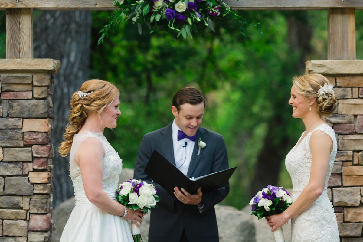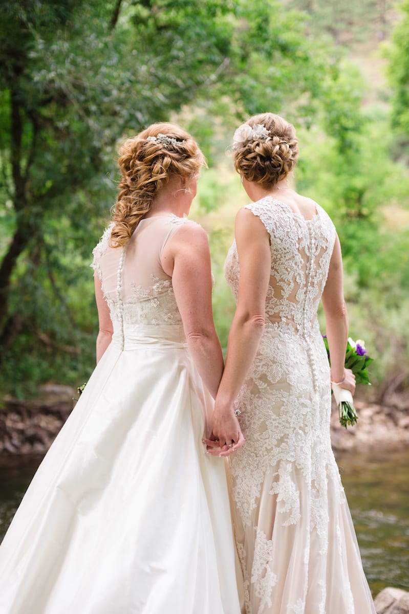 The Wedgewood Wedding and Banquet Center alongside the Boulder Creek in Boulder, Colorado was the perfect backdrop for their special day. Nestled deep in the Boulder Canyon, it was the perfect amount of secluded, making it all the more romantic! The creek, in particular, was absolutely stunning behind the two brides in lace, but we can all agree that their beautiful dresses and radiant smiles put it to shame. We love how the bright green foliage drew, even more, attention to their gorgeous dresses, contrasting against the darker shades.