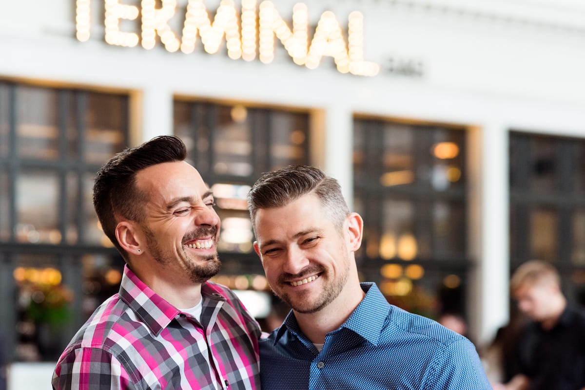 From the fountains outside, to the inside of the station itself and the neat places around Denver’s Union Station, this duo took every backdrop in stride…and hand-in-hand of course! Michael and Aaron weren’t hesitant to snuggle up to each other in the warm lighting of the station. They look especially lovely with a big chandelier behind them, casting them in a silhouette.