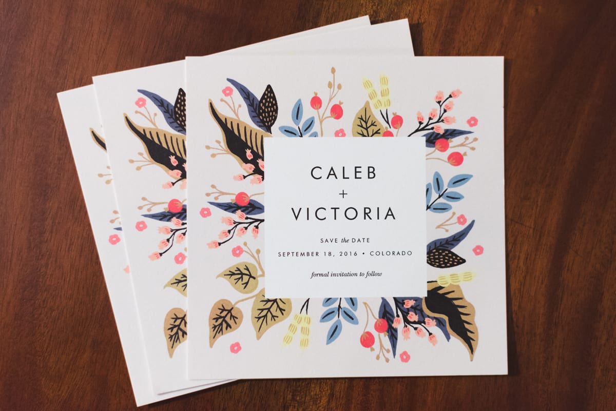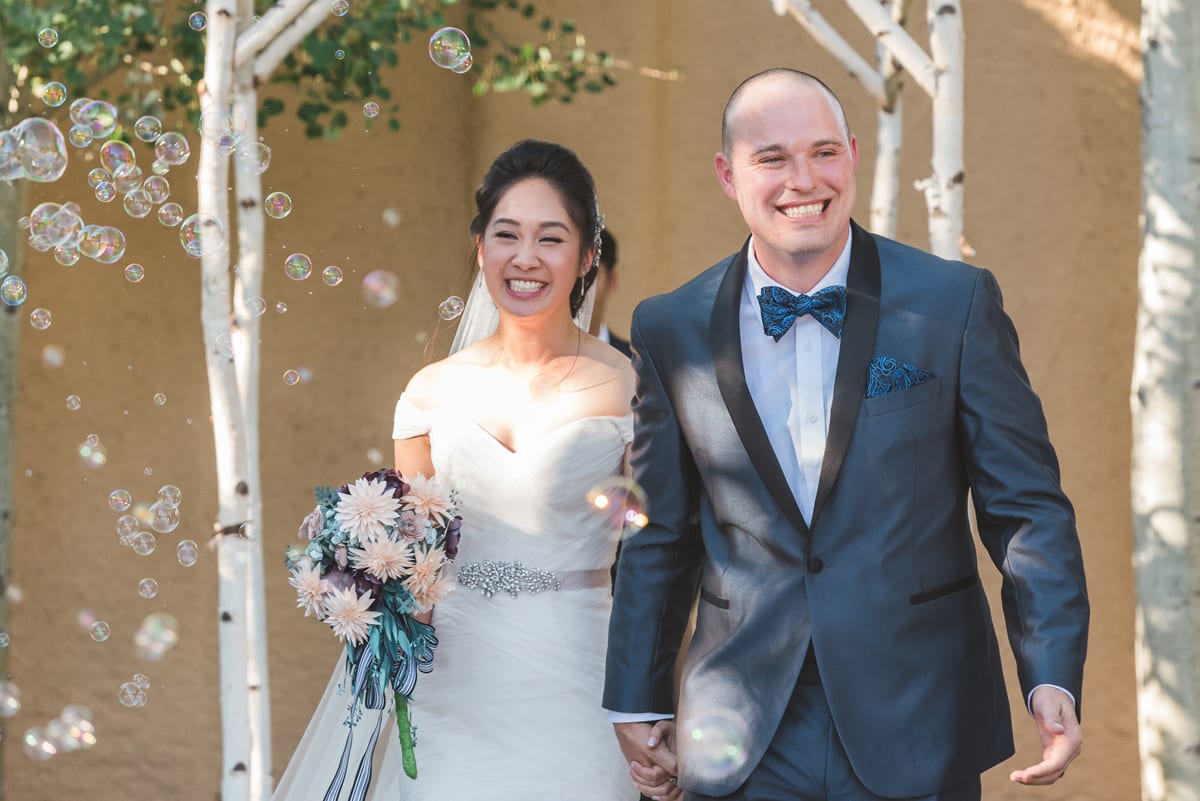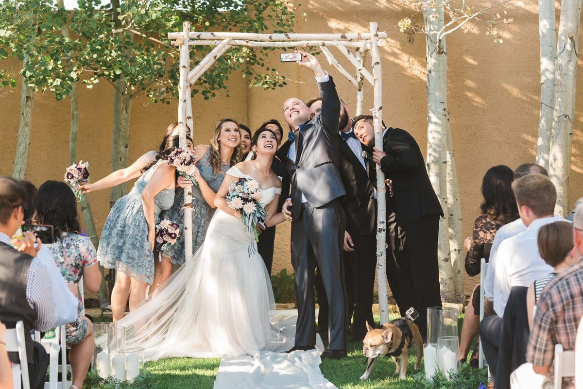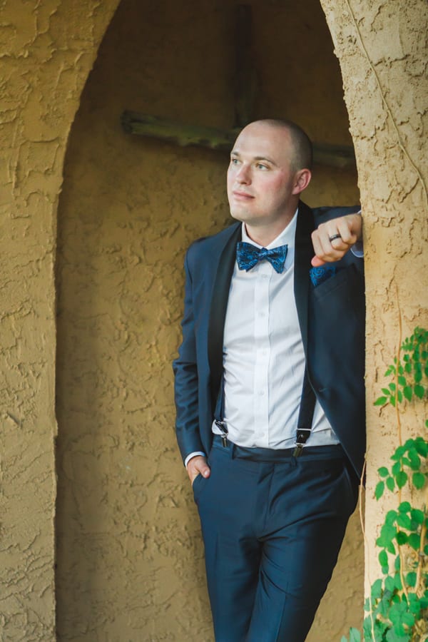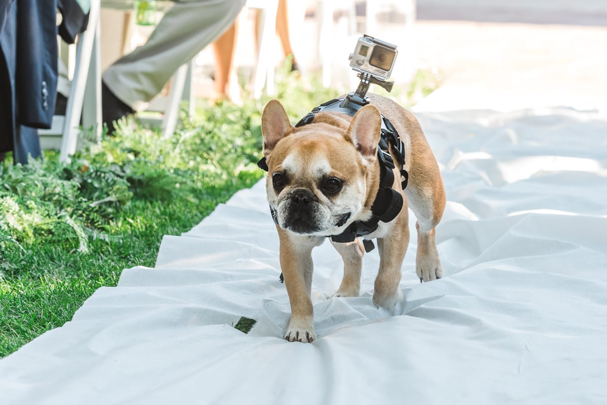 The wedding ceremony took place at the rustic Villa Parker venue in Parker, Colorado. We’d be lying if we said our hearts didn’t melt when furry little Archer the French bulldog walked down the aisle and took a seat on his dad’s dress shoes. Caleb and his groomsmen looked dapper as ever in matching blue bowties at the altar made out of aspen trees. Archer even had on a black bowtie himself! Plus, he pulled double-duty as the videographer for the day (with a GoPro camera harnessed to his back). We would love to see what he captured!